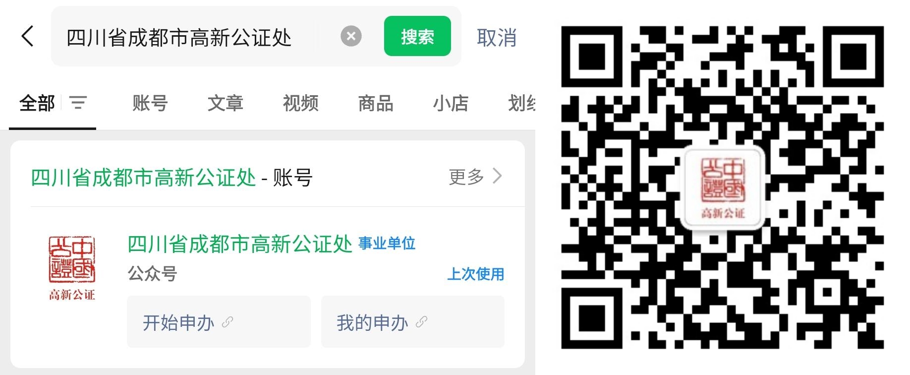 关注“四川省成都市高新公证处”微信公众号,点击“开始申办”